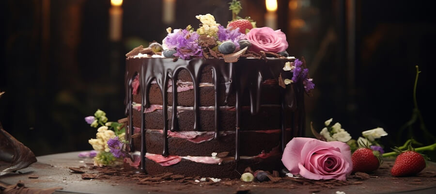 کیک شکلاتی با تزئینات گلهای رنگارنگ